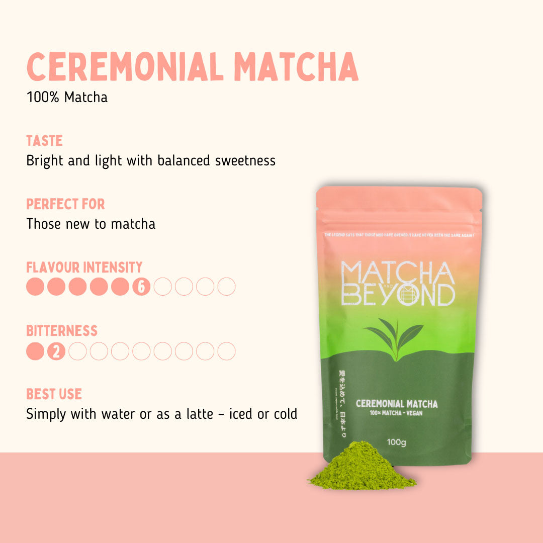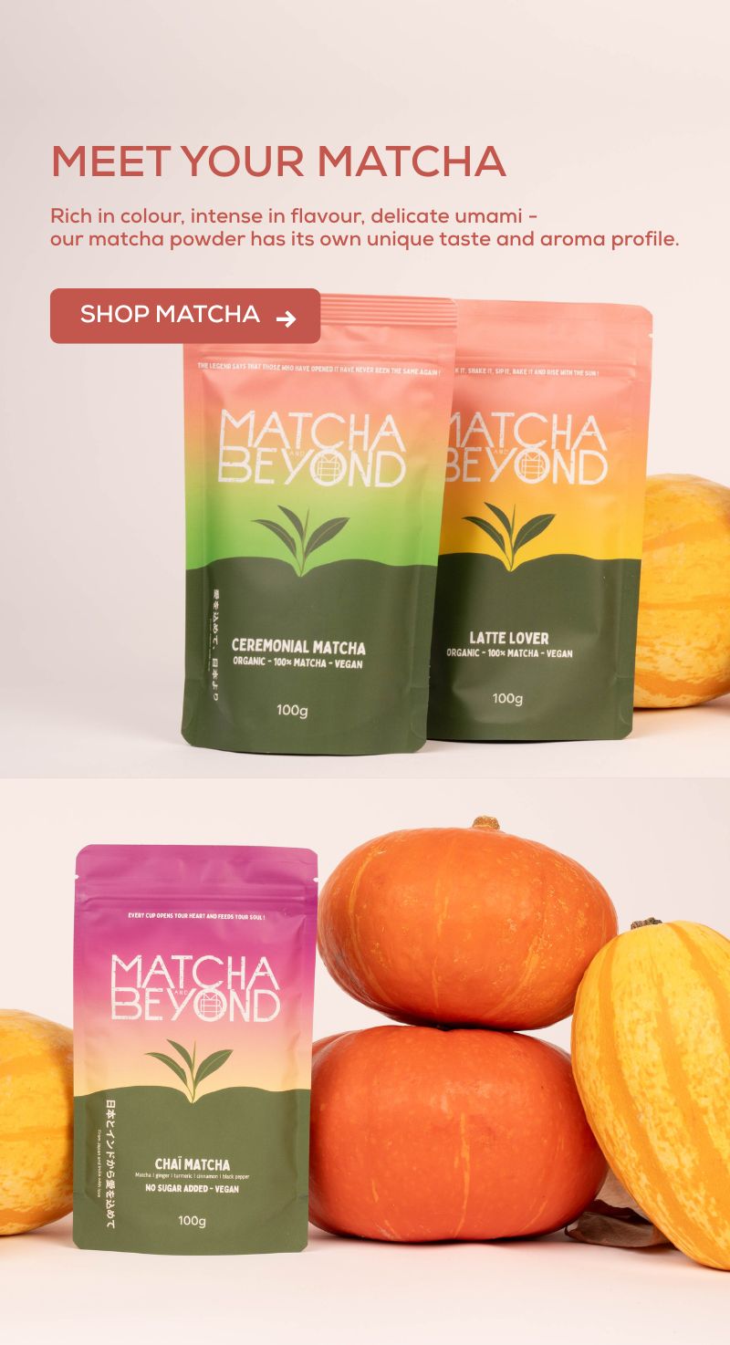 Matcha is the result of a meticulous process which starts with manually extracting only the most tender, highly prized parts of the leaves grown on trees in the shade. These leaves are then steamed, airdried, de-stemmed, de-veined and finally, stone-ground into a fine powder. By drinking Matcha and Beyond's matcha, you will appreciate the careful work of these artisan farmers.